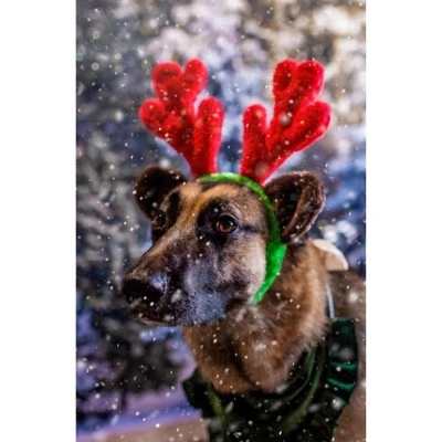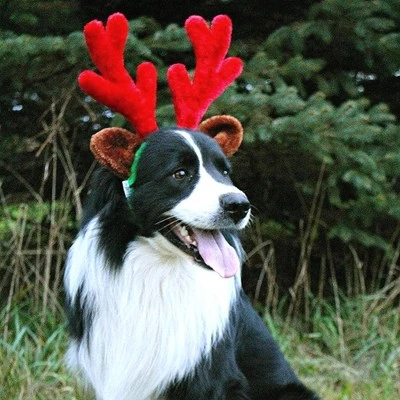 Stretches from 4″ to 8″ wide in diameter. Good for large dogs. 7″ tall red plush reindeer antlers. Fuzzy fabric ears and headband for dog’s comfort. Elastic chin strap to help keep on your dog. Silly & fun way to keep your dog involved in holiday pictures.